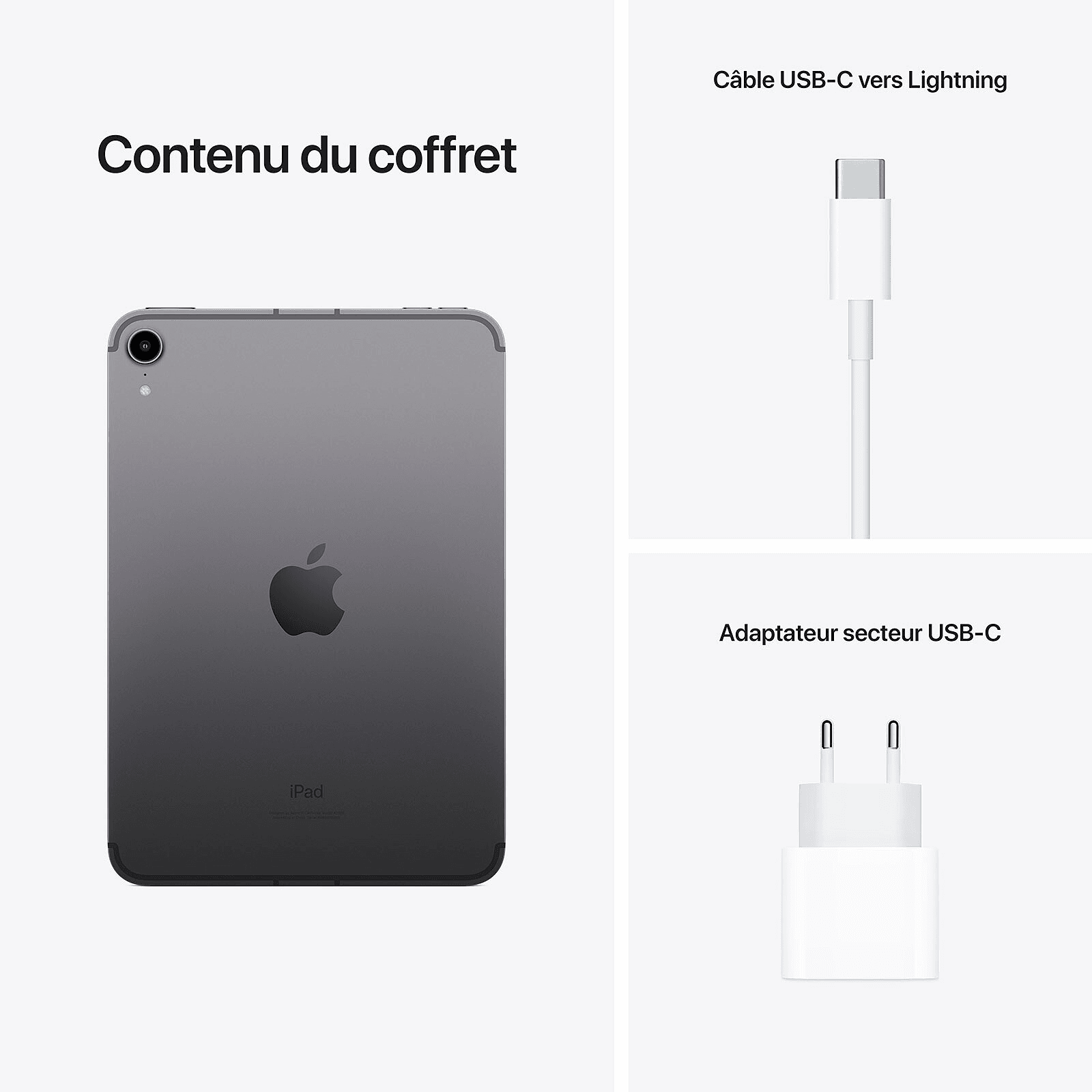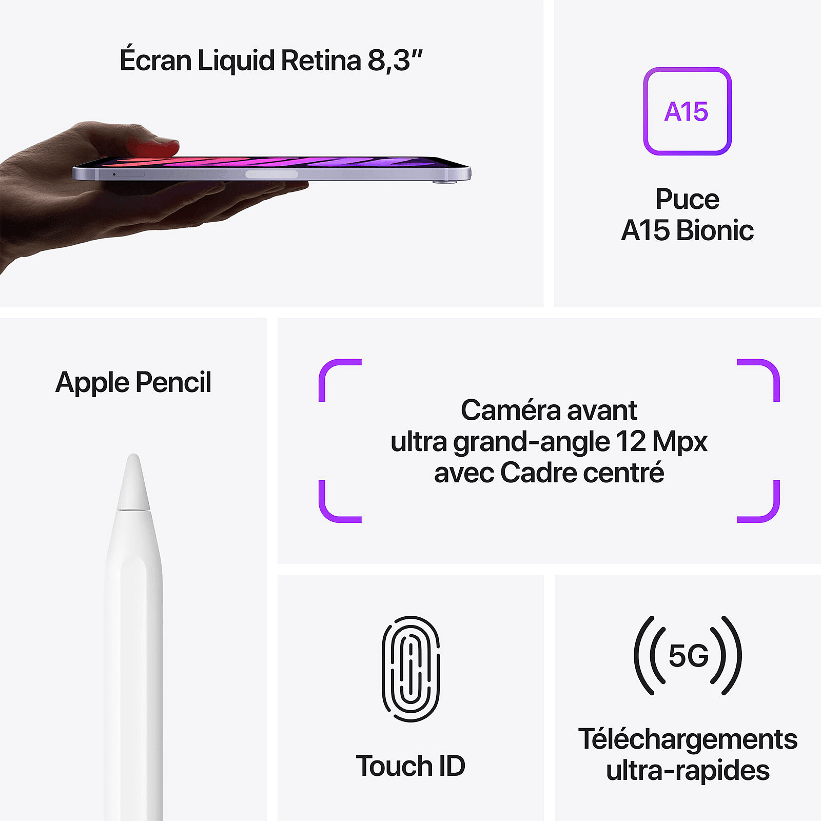 Apple A15 Bionic 64 bits – eMMC 64 Go – Écran 8.3″ Liquid Retina LED tactile – Wi-Fi AX / Bluetooth 5.0 – Webcam – USB-C – iPadOS 15